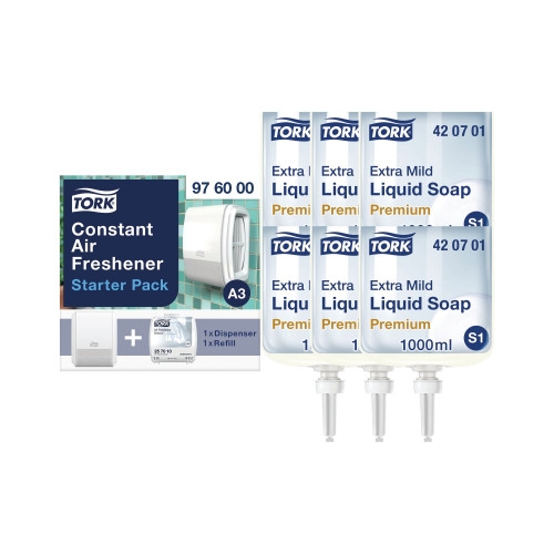 Tork Extra Mild Liquid Soap Refill S1 Non Perfumed 1 Litre (Pack of 6) 420701 + FREE Tork Air Freshener Pack
